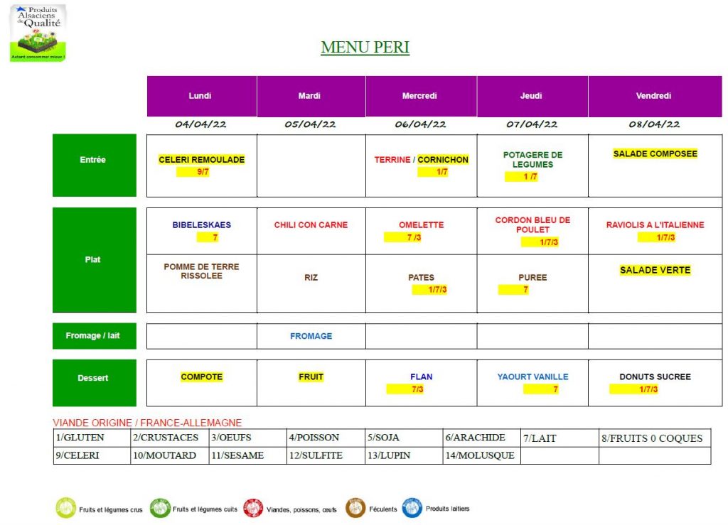 MENU DU 04 au 08 AVRIL