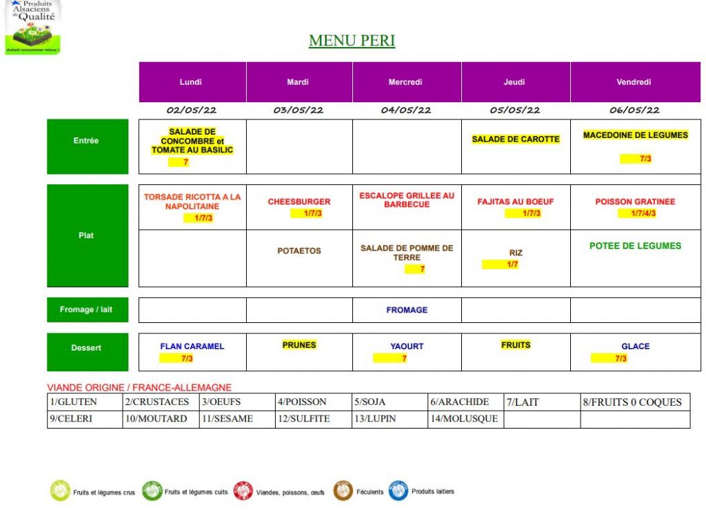 MENU DU 02 AU 06 MAI