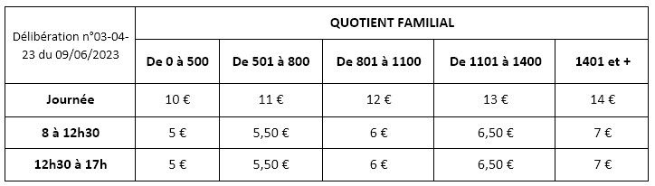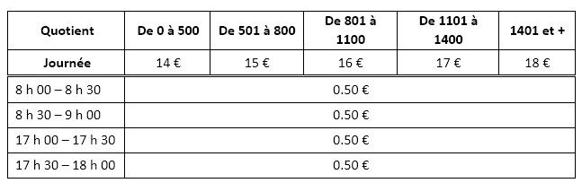 Le tarif appliqué pour chaque famille est calculé chaque année en fonction du quotient familial. Il est impératif de le fournir, à défaut le tarif les plus élevé sera facturé.